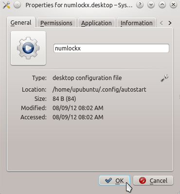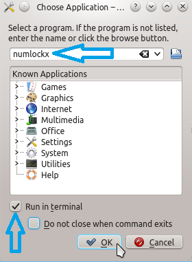 5. Na janela que aparece, digite numlockx, marque a caixa "Run in terminal"e clique em OK: